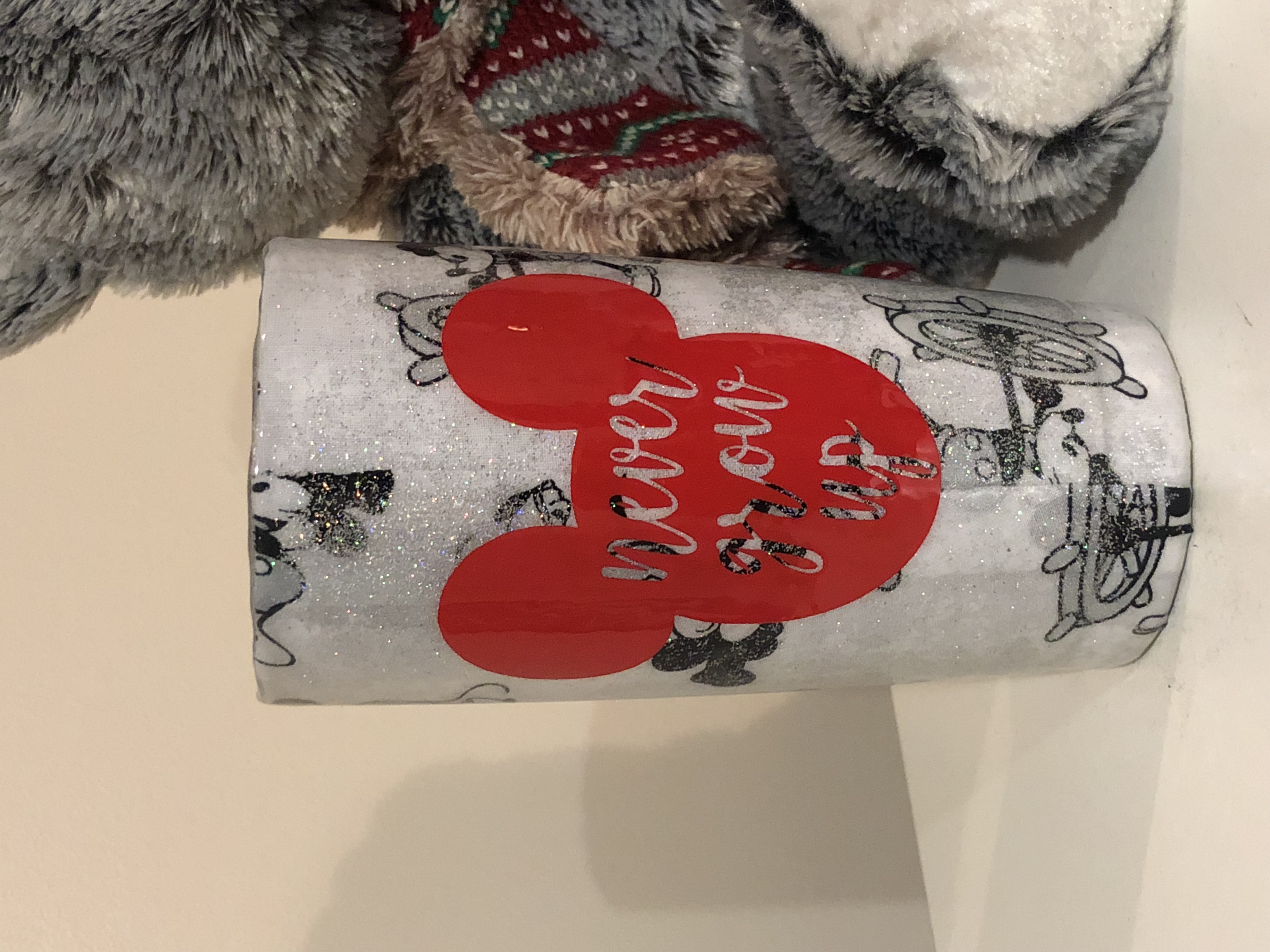 Look at this beauty ???! Sailor Mickey Tumbler (Happy 90th Mickey!) with accent glitter and one of our favorite quotes from Peter Pan “Never Grow Up”. And of course couldn’t forget about the customization ♥️!